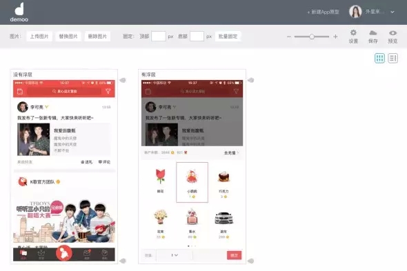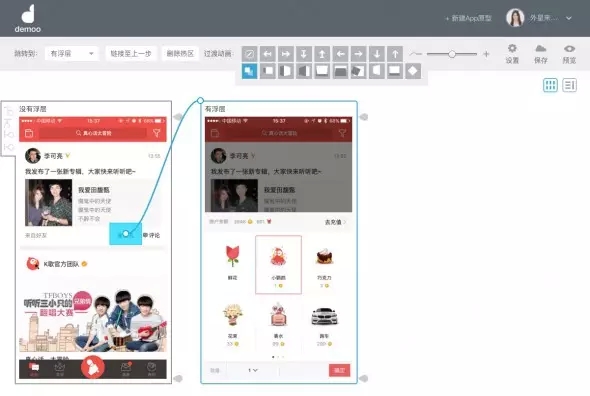 最后,聽說很多試用過的朋友都在詢問,如何在Demoo中模擬浮層的效果,Demoo其實(shí)更擅長的是頁面之間的跳轉(zhuǎn),那么如何模擬呢?這里給大家一個小技巧。
