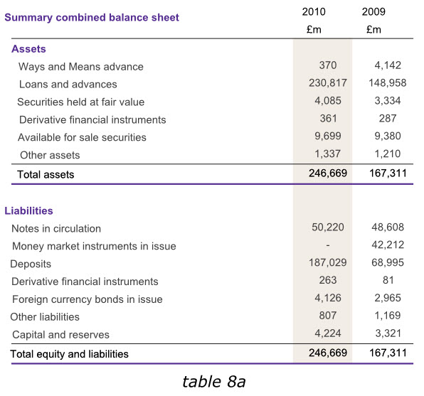 鑒于此,我們需要采用其他年報(bào)慣用的展示方式,以符合讀者的閱讀習(xí)慣,保證數(shù)據(jù)展示的清晰準(zhǔn)確。請注意,下表中更清晰的那副,是基本上完全根據(jù)英格蘭銀行2010年年報(bào)格式制作,是清晰展示數(shù)據(jù)表格的優(yōu)秀樣本。
