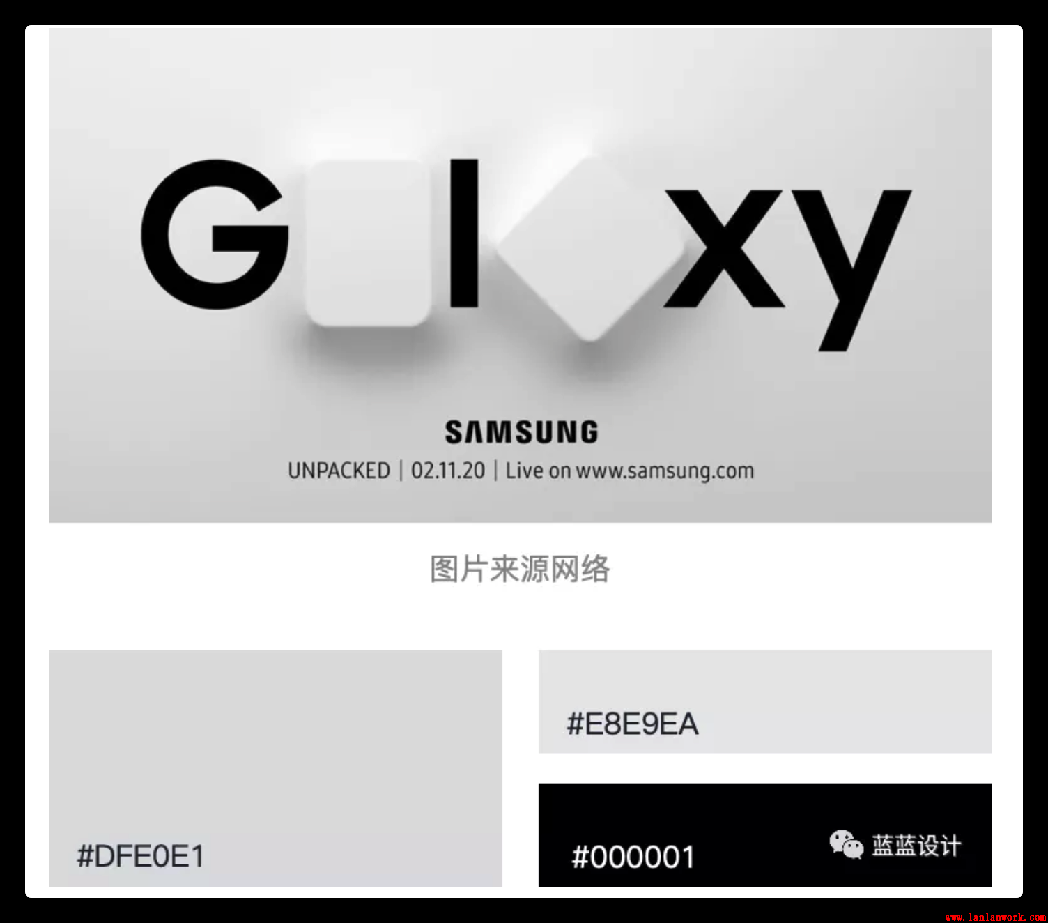 在2020年2月11號舉行的三星視覺發(fā)布會使用新擬態(tài)的設(shè)計(jì)手法作為設(shè)計(jì)海報(bào)。帶有漸變的淺灰色背景,結(jié)合富有層次感的光影漸變,充滿未來感。相對克制的色彩選擇和多角度的光影變化,強(qiáng)調(diào)出產(chǎn)品豐富的質(zhì)感和科技感,簡潔而神秘。