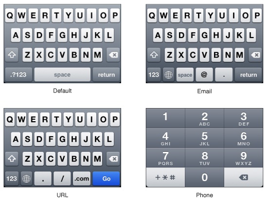 - 智能手機(jī)的系統(tǒng)平臺(tái)當(dāng)中通常都會(huì)內(nèi)置一些針對不同類型內(nèi)容的鍵盤,例如文本、數(shù)字、Email、URL等。在你的應(yīng)用中,確保針對不同的內(nèi)容類型使用對應(yīng)的鍵盤,提升用戶輸入的效率。