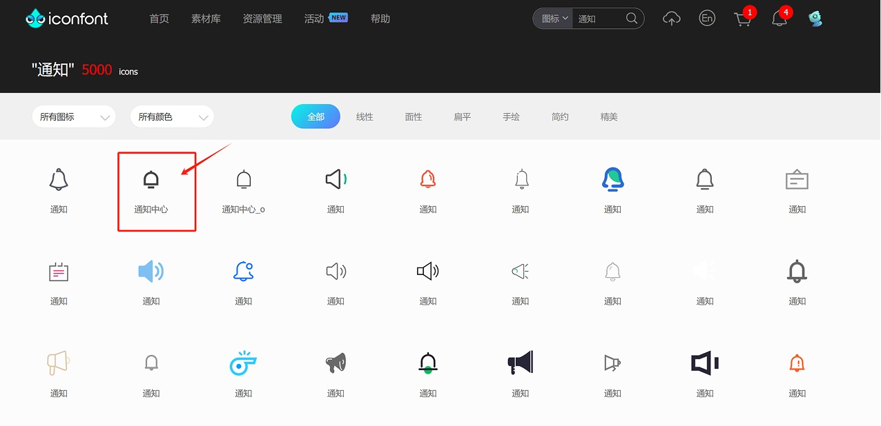 我就拿最常用的阿里巴巴圖標庫,打開網(wǎng)址,找通知圖標,直接下載第一頁,第 1 排第 2 個: