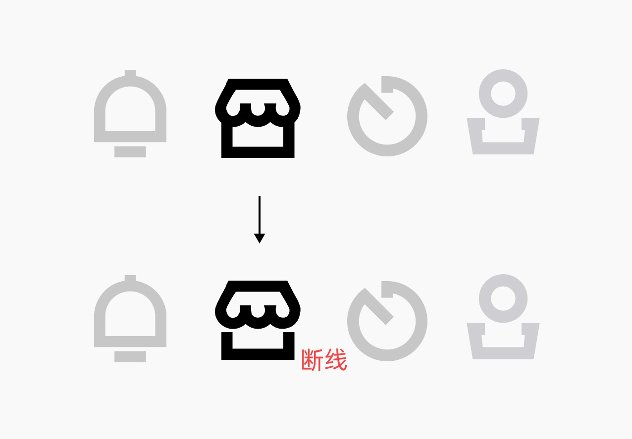 直角圓角統(tǒng)一了之后,還有一個統(tǒng)一性就是斷線,只有第二個沒有斷開的設計,所以我們再把商城進行斷線處理: