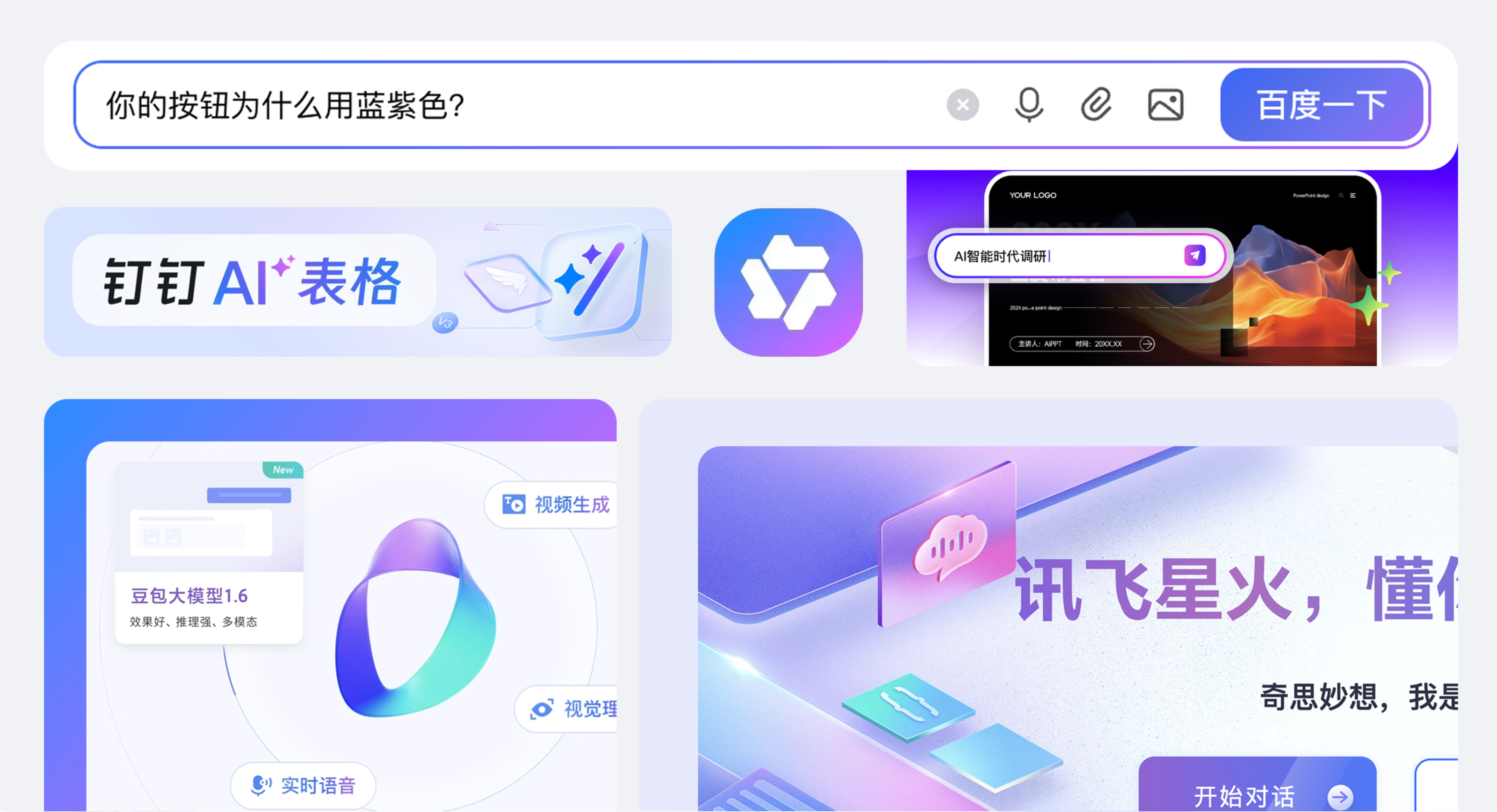 打開(kāi)手機(jī)里的各類 AI 應(yīng)用,你大概率會(huì)被一種藍(lán)紫色調(diào) “包圍”:通義 APP 的 logo、百度的問(wèn) AI 按鈕、釘釘?shù)?AI 表格圖標(biāo)、訊飛星火的官網(wǎng) banner……