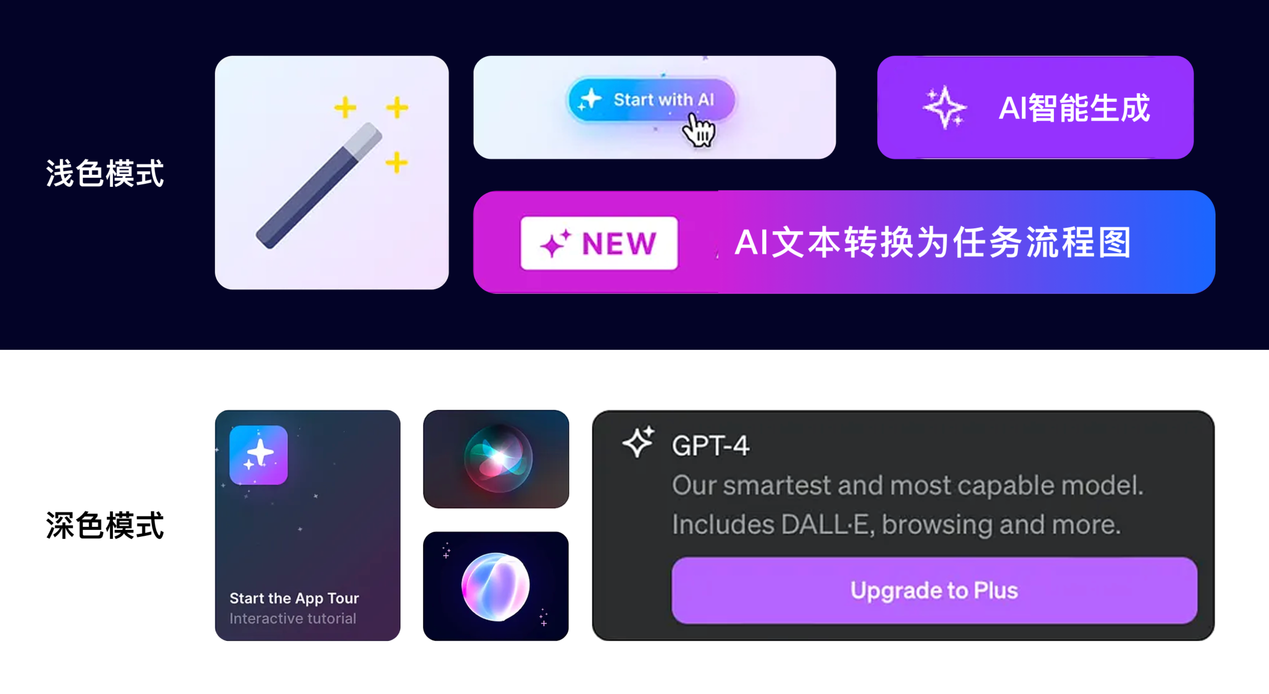 但僅靠藍(lán)色遠(yuǎn)遠(yuǎn)不夠,AI 功能還需凸顯 “新意”,避免陷入傳統(tǒng)科技產(chǎn)品的沉悶感。此時(shí)紫色的加入,恰好補(bǔ)上了 “創(chuàng)新感” 的缺口:紫色由藍(lán)色與紅色調(diào)和而成,既保留了藍(lán)色的理性穩(wěn)重,又融入了紅色的活力,卻無(wú)紅色的刺眼感,比藍(lán)色多了幾分創(chuàng)造力與神秘感。