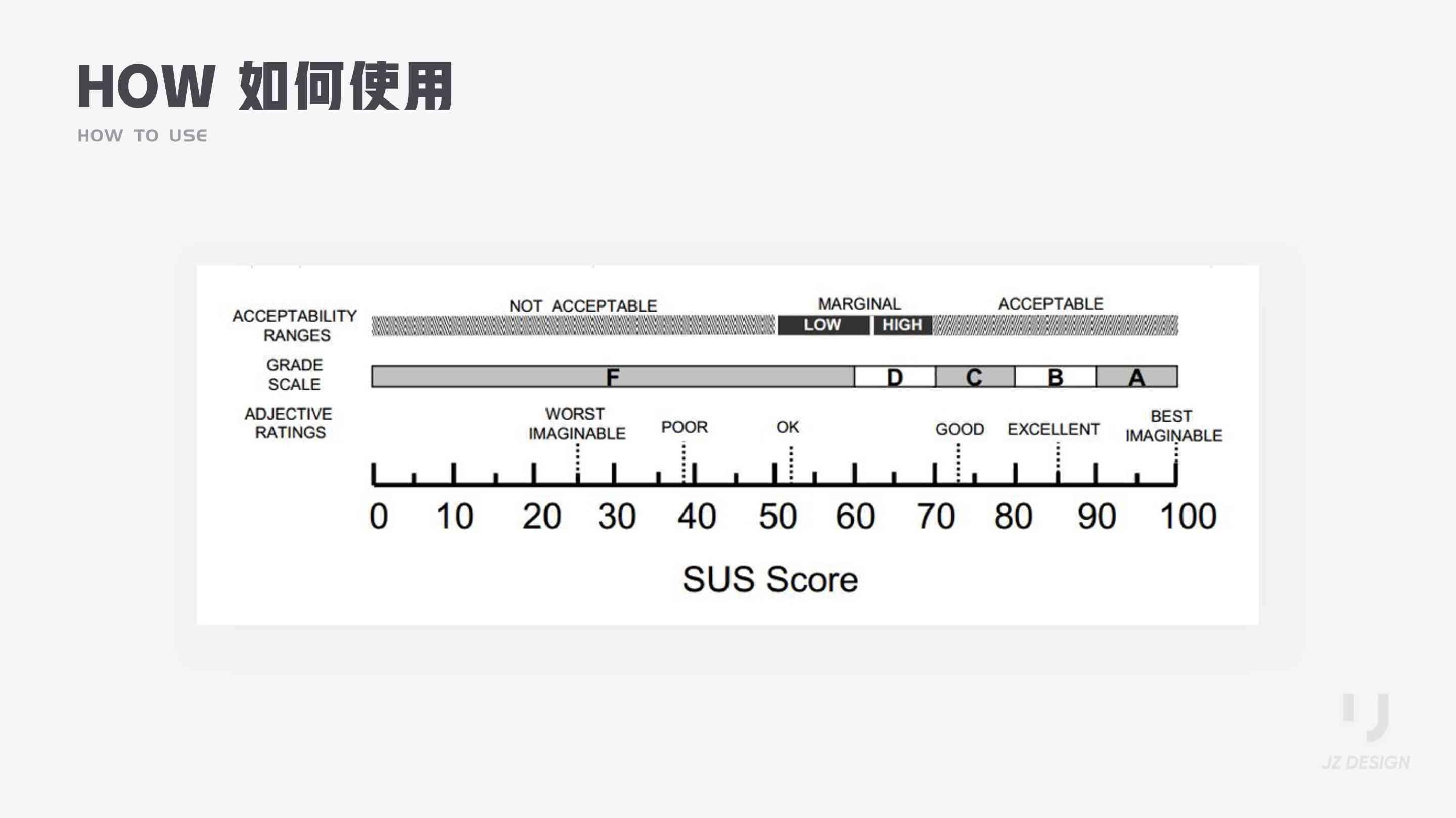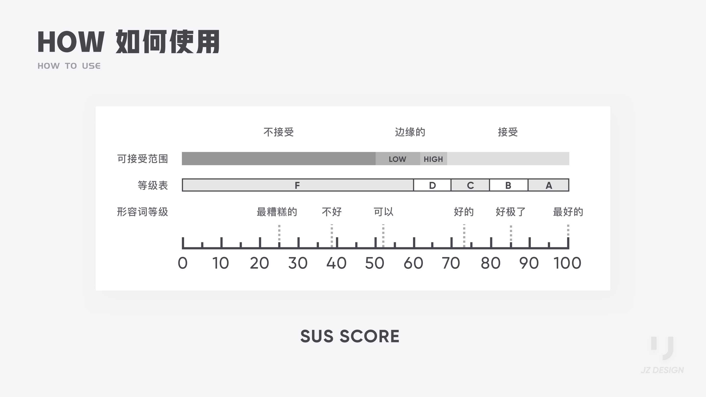 3. 將所有問題最后的得分加在一起,然后乘以2.5;(每個題目的得分范圍記為0~4,最大值為40,SUS可用性得分的范圍在0~100,換算后乘以2.5)